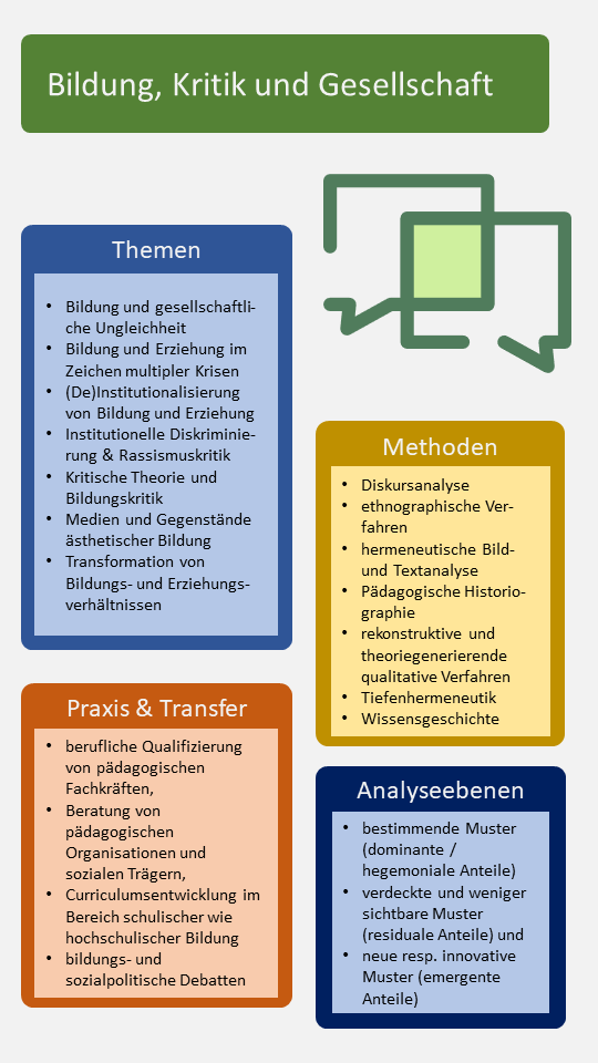 Ziel ist sowohl die empirische Analyse als auch die Analyse und kritische Reflexion impliziter, normativer und affektiver Dimensionen pädagogischer und sozialer Ordnungen.